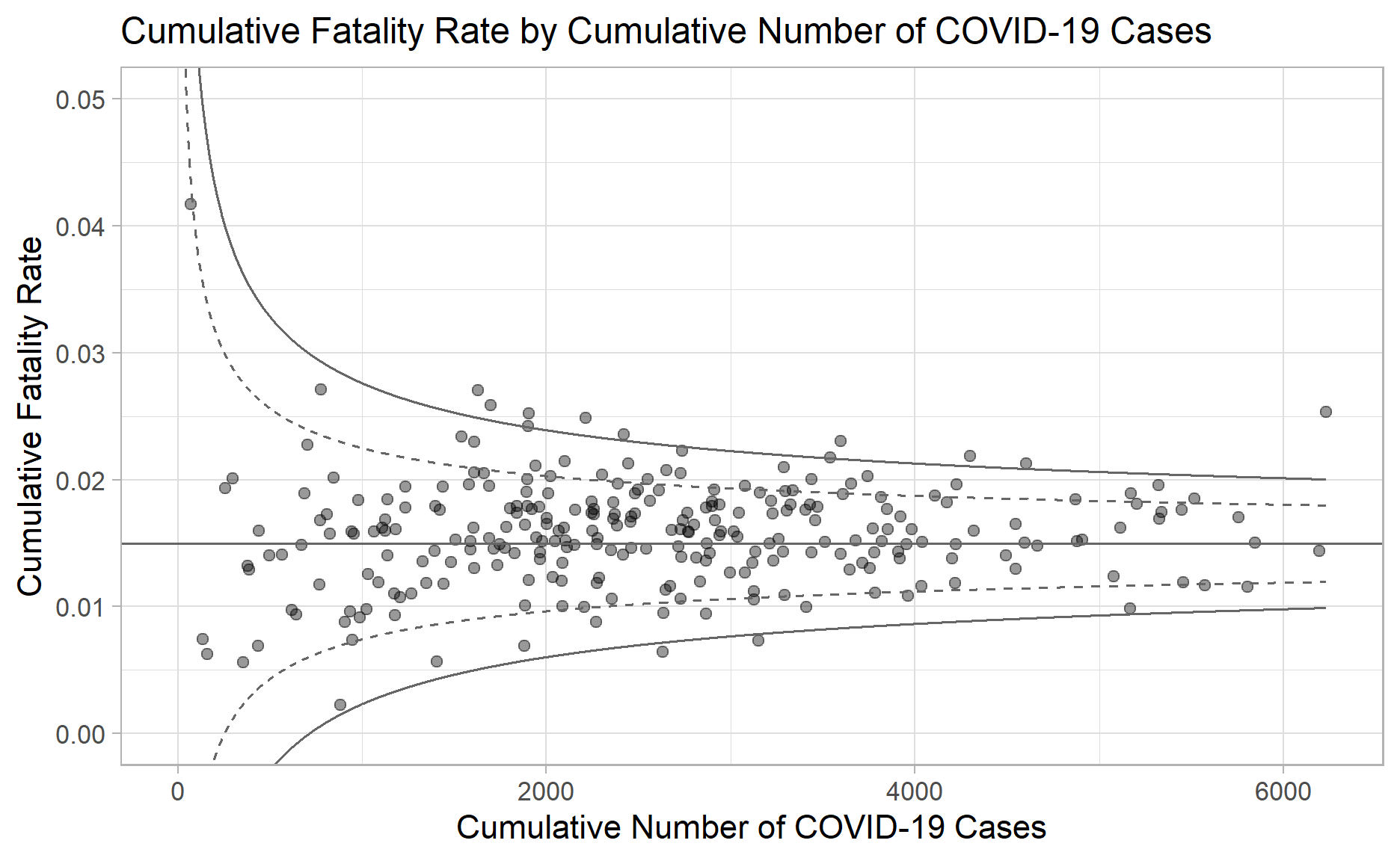 ggtitle("Cumulative Fatality Rate by Cumulative Number of COVID-19 Cases") +